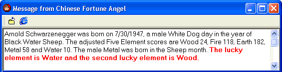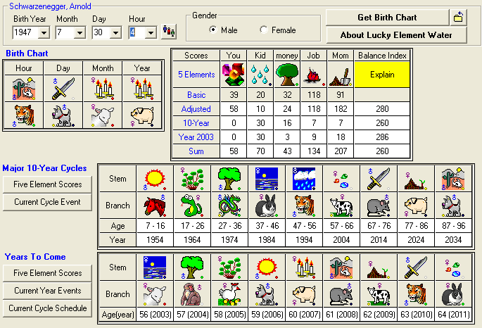 The Birth Chart shows Arnold Schwarzenegger has too much Earth, too much Fire, too little Water and too little Wood. The Birth Chart is too dry. The Angel software selected Water and Wood as his Lucky Elements. Metal represents Arnold Schwarzenegger. His has very good career opportunity since lots of Fire (Job). Fire gives Metal pressure. But he has enough Earth around to release the pressure from Fire. Earth represents the people supporting him. He has enough supporters and doesn't need more Earth. If more Earth (people) comes in his cycle, then too many opinions could confuse his decision and lose his intelligence (Water), which is unfavorable to his fame.