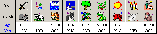 | Age | Major Cycle | Stem and Branches | Astrology Sign |