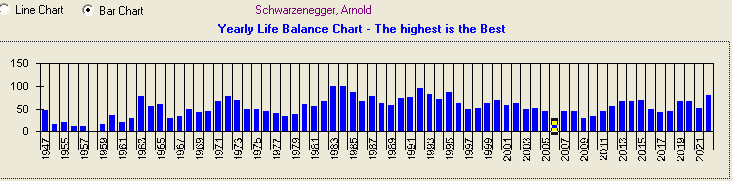 The Birth Chart shows Arnold Schwarzenegger has too much Earth, too much Fire, too little Water and too little Wood. The Birth Chart is too dry. The Angel software selected Water and Wood as his Lucky Elements. Metal represents Arnold Schwarzenegger. His has very good career opportunity since lots of Fire (Job). Fire gives Metal pressure. But he has enough Earth around to release the pressure from Fire. Earth represents the people supporting him. He has enough supporters and doesn't need more Earth. If more Earth (people) comes in his cycle, then too many opinions could confuse his decision and lose his intelligence (Water), which is unfavorable to his fame.