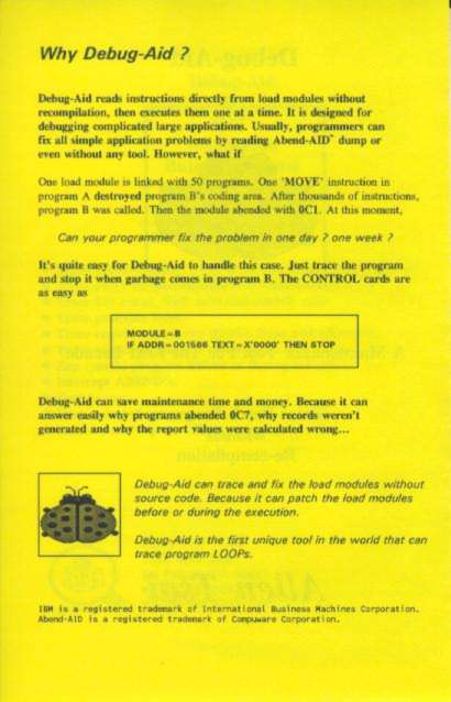 Debug-Aid is a maintenance tool for IBM mainframe. It's can trace programs without recompile them. It's a only tool in the world can trace a program loop. It's written in IBM Assembler.