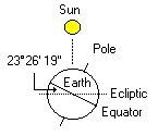 The Ecliptic is the Sun's apparent path around the Earth. It's tilted relative to the Earth's equator. The value of obliquity of the Ecliptic is around 23 26' 19'' in year 2000. |