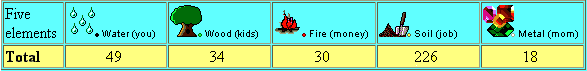 As we discussed above, your foe is Money and Job, which gives you pressure all the time. Mom is your friend always. If the scores from Foe are much greater than the scores from You and your friend, then You and Mom are the lucky elements. If the scores from Foe are much less than the scores from You and your friend, then Money and Job are the lucky elements. For example, the total of Metal and Water is 18+49 = 67 and the total of Fire and Soil is 30+226 = 256. Therefore the lucky elements in the Five Element Chart above are Metal and Water.