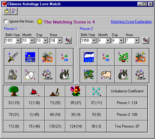 This theory balances two sets of the Five Elements. According to the Basic Concept of Five Elements, people will have a better luck if their Five Elements are in good balance. So we can calculate the unbalanced coefficient of the Five Elements for each person first. Then we combine both person's Five Elements and recalculate the unbalanced coefficient. If the combined unbalanced coefficient is lower than both people's unbalanced coefficient, then that's a good match.