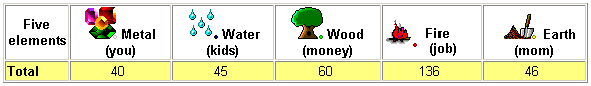 Form the Five Element Scores, It's easy to tell that Fire is the most strongest element in the birth chart. The birth chart needs Water to balance the heat.