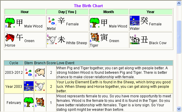 The Cycles of Love calculated the love scores for every month, the major 10-year cycle, and the year you ask for. The score is calculated using the Five Element relationships and some hidden stars of marriage, happiness, popularity and loneliness. So you can know when you will be in love and the chance for the marriage.